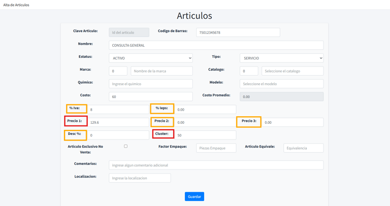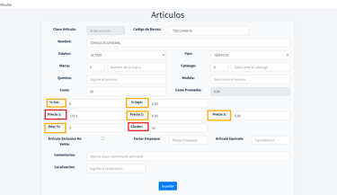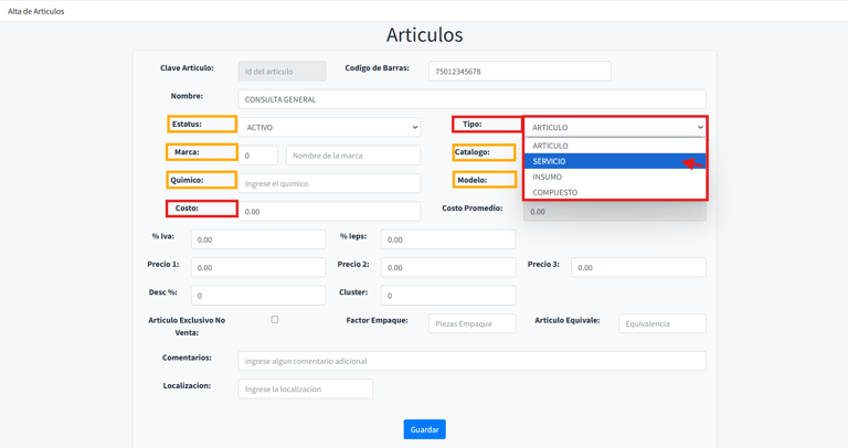 Una vez que hayas completado y validado toda la información del artículo o servicio, haz clic en el botón Guardar para procesar el alta.