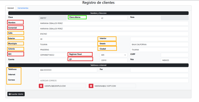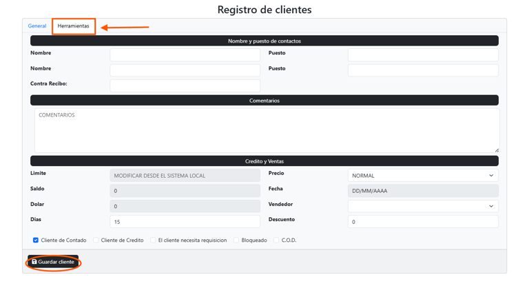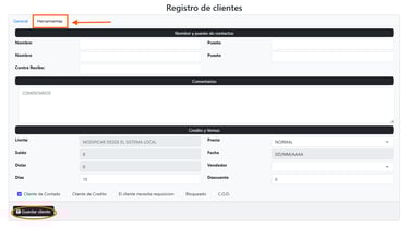 Pestaña: Herramientas: En esta pestaña se complementa el registro del cliente con información clave para su gestión administrativa y comercial. Los campos disponibles son: