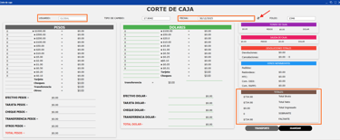Los montos ingresados se suman automáticamente en los totales ubicados en la parte inferior de cada tipo de moneda, así como en el total general situado en la parte inferior derecha, donde el sistema indica sobrantes o faltantes, comparando lo contado contra lo vendido.Adicionalmente, en el panel derecho se visualiza la información correspondiente a: