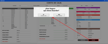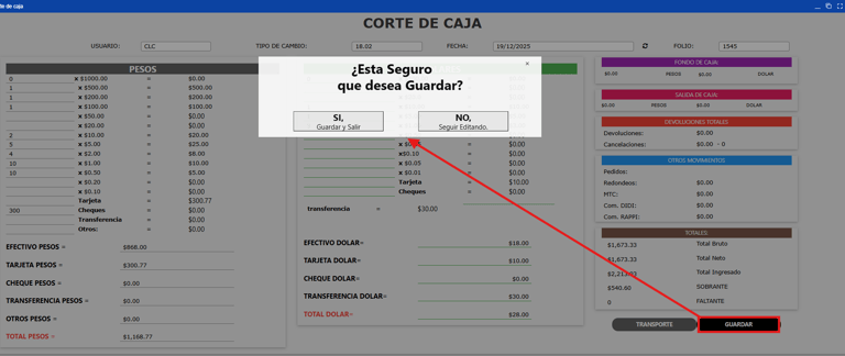 Una vez capturada la información correspondiente, cuadrado y validado el corte de caja, se da clic en el botón Guardar.