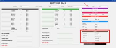 Los montos ingresados se suman automáticamente en los totales ubicados en la parte inferior de cada tipo de moneda, así como en el total general situado en la parte inferior derecha, donde el sistema indica sobrantes o faltantes, comparando lo contado contra lo vendido.Adicionalmente, en el panel derecho se visualiza la información correspondiente a: