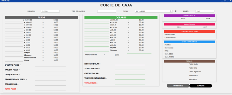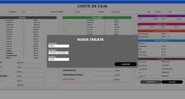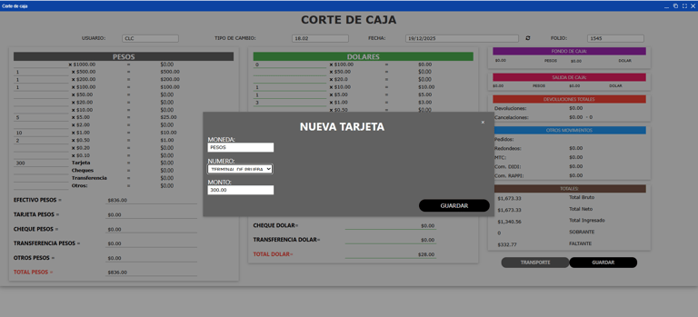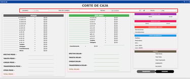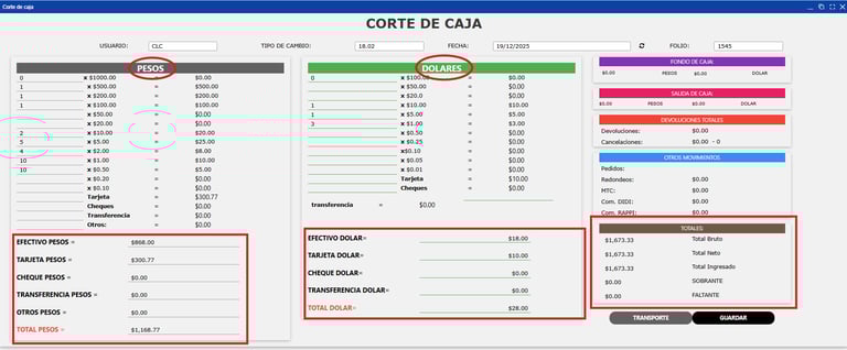 Se procede a contar el efectivo, los pagos con tarjeta (en pesos o dólares) y cualquier otro método de pago aceptado, capturando los importes en los campos correspondientes.