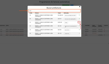 Utilizar el buscador para filtrar y seleccionar entre tus prefacturas disponibles.