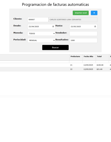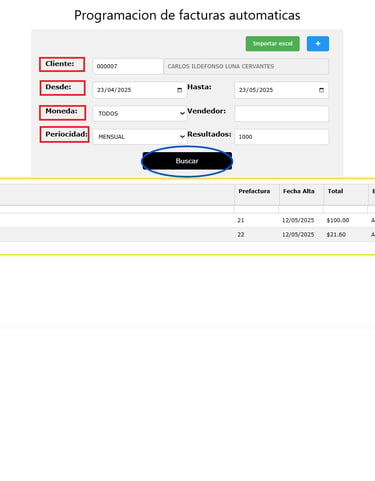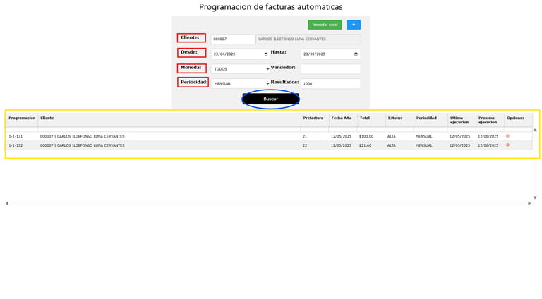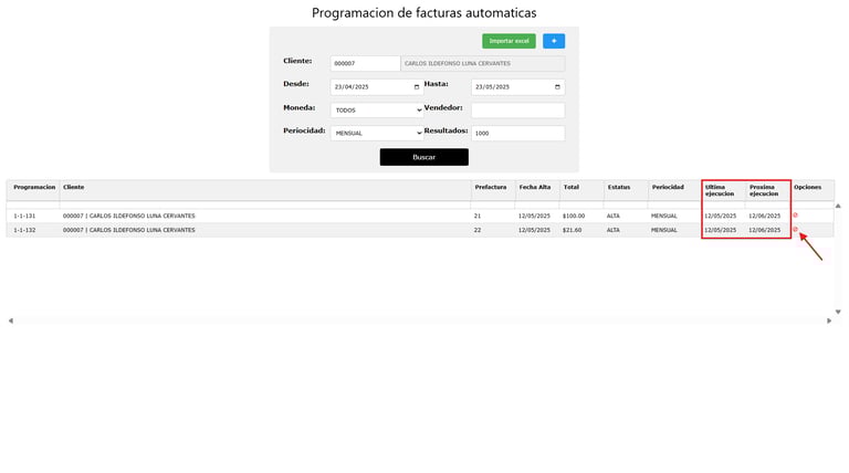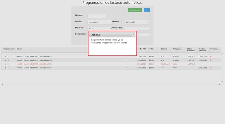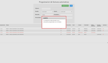 En el listado que se muestra en la parte inferior, además de poder filtrar por criterios como cliente, fechas, moneda, vendedor y periodicidad, también se presenta información detallada de cada factura programada.