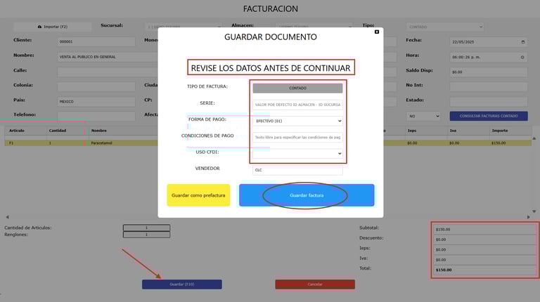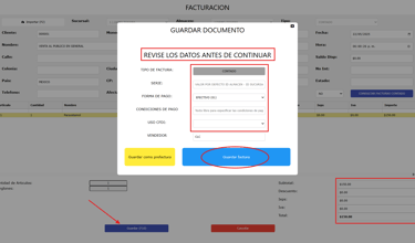 Una vez verificada y completada la información, concluye el proceso dando clic en Guardar factura.
