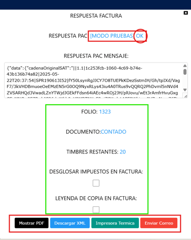 Una vez generada la factura, se abrirá una ventana mostrando el resultado de la emisión con un indicador "OK" si fue exitosa.