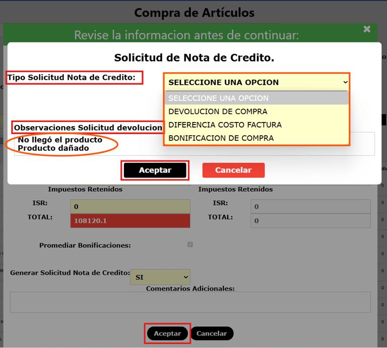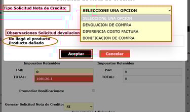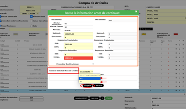 Es muy importante indicar correctamente la opción “Generar Solicitud de Nota de Crédito”: