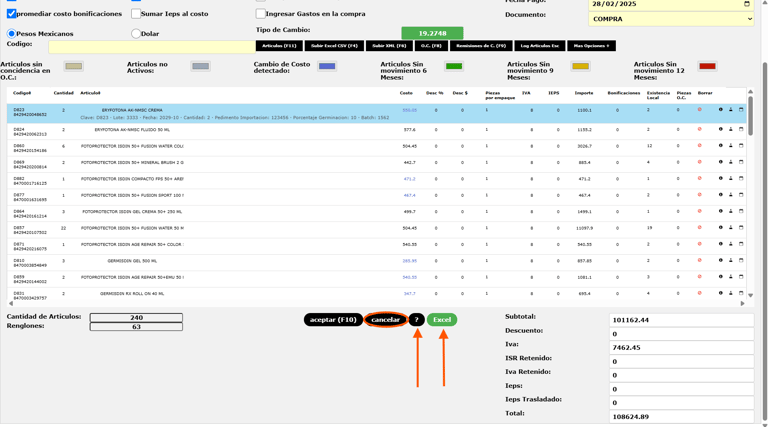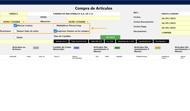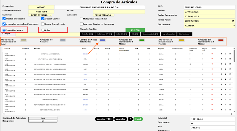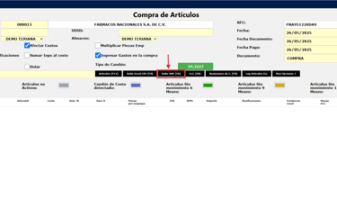 Es importante definir la moneda correcta antes de cargar el XML, para que la información se registre con el tipo de cambio correspondiente según aplique la compra.Además, al cargar los productos desde el XML, el sistema mostrará indicadores de color que te ayudarán a identificar situaciones específicas con los artículos: