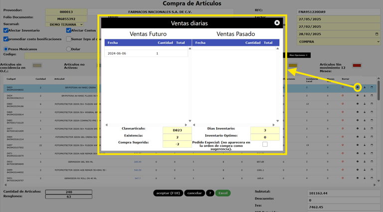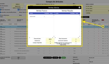 Al hacer clic, se despliega una ventana con datos relevantes del artículo, incluyendo:Ventas del año anterior correspondientes al mismo mes próximo al actual