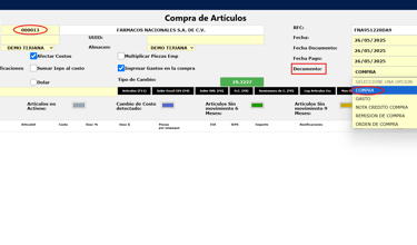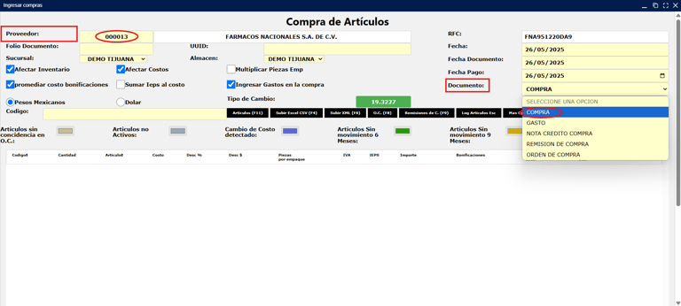 Se abrirá una ventana donde comenzarás el registro de la compra.Selecciona al proveedor correspondiente e indica el Tipo de documento como COMPRA.