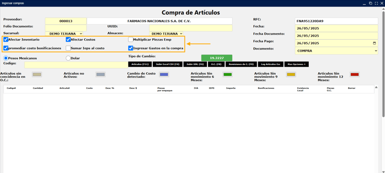 ✅ Afectar costos (marcada por defecto): actualiza el costo promedio de los artículos.
