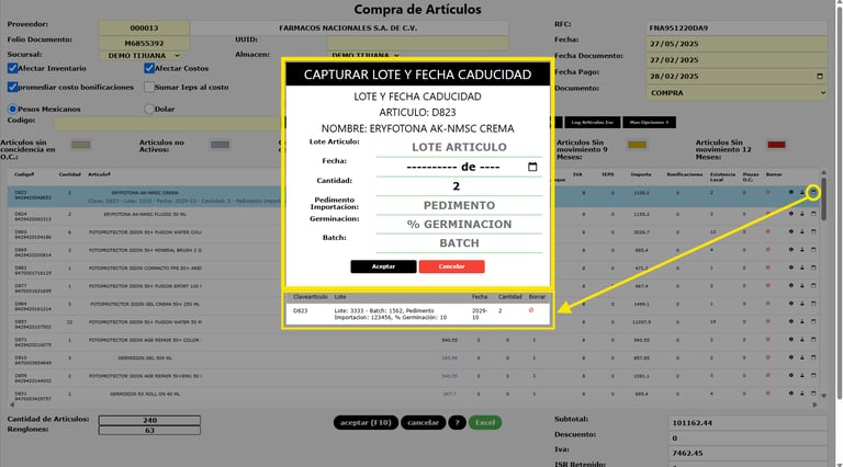 La ventana se cerrará automáticamente y, para concluir el proceso por completo, deberás dar Aceptar nuevamente en la pantalla principal del ingreso de compra.