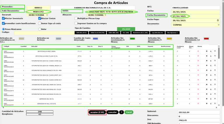 Productos: se cargarán de forma automática si el proveedor timbra usando el código de barras y este coincide con el registro existente en el sistema (Cerapp).