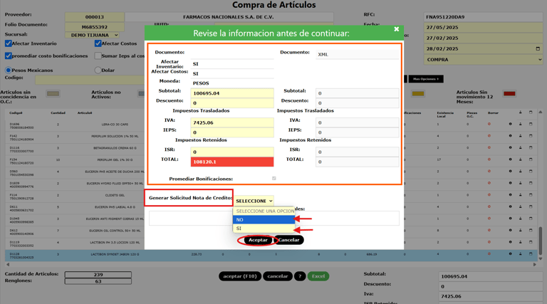 Selecciona SÍ si existe algún faltante, producto dañado o error. En este caso, el sistema generará automáticamente una solicitud de nota de crédito, excluyendo los artículos correspondientes del ingreso para no afectar el inventario.