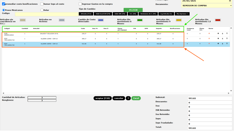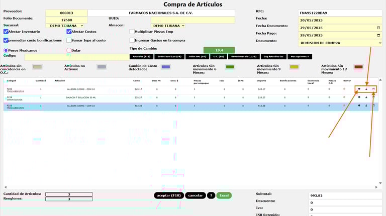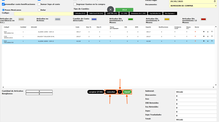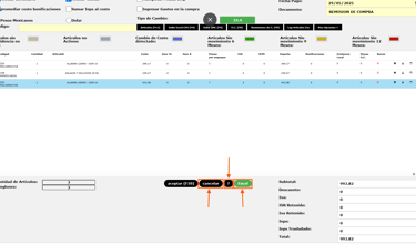 En la parte inferior de la ventana de ingreso (ya sea compra o remisión de compra), encontrarás los siguientes botones: