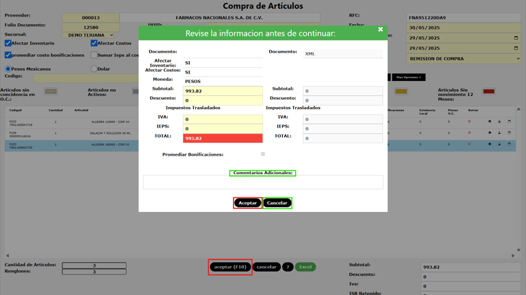 ✅ Si todo está correcto, da clic en Aceptar para finalizar el ingreso de la remisión.