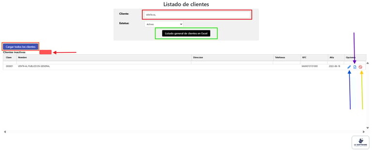 📌Los clientes inactivos aparecerán marcados en color rojo, facilitando su identificación en el listado general.