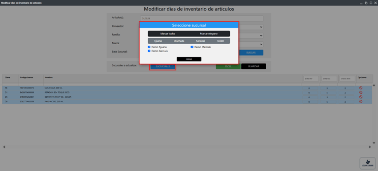 Una vez validados los cambios a aplicar, se da clic en el botón “Sucursales” para seleccionar las sucursales en las que se reflejarán las modificaciones.