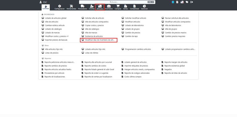 Se ingresa al ERP GLOBAL y, desde el menú principal, se selecciona el módulo de Artículos y posteriormente la opción Modificar días de inventario de artículos.