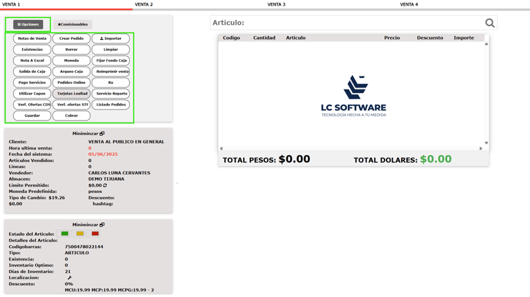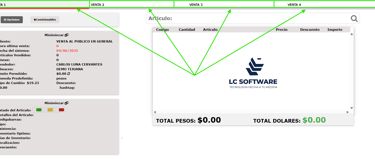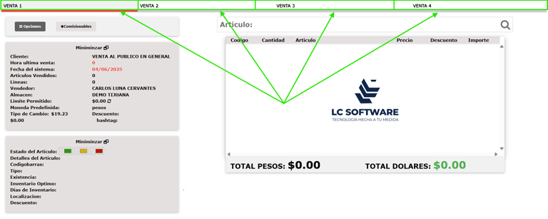 Venta 1, Ventana 2, Ventana 3 y Ventana 4.Estas te permiten tener varios procesos de venta activos de forma simultánea, lo cual es útil cuando se está atendiendo a varios clientes.