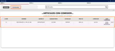 En la parte superior izquierda encontrarás dos botones. Uno de ellos es "Comisionables", el cual despliega una lista de los productos que generan comisión para el vendedor. Esta función permite al personal conocer qué artículos pueden impulsar estratégicamente, incentivando su venta para obtener una mayor ganancia.