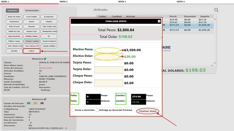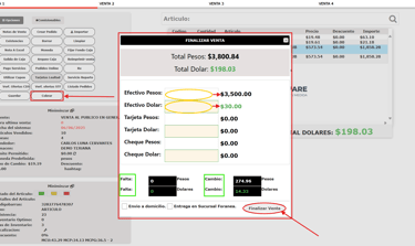 Una vez agregados todos los productos e ingresado el monto cobrado (ya sea en efectivo, tarjeta o dólares), presiona el botón "Finalizar Venta" para completar la operación.
