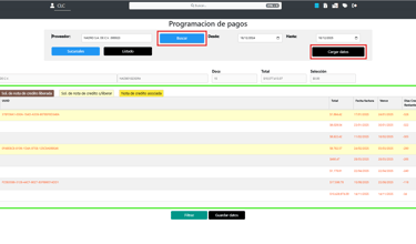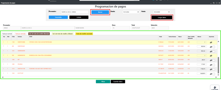 Una vez seleccionado el proveedor, se presiona el botón Cargar datos, con lo que las facturas correspondientes se visualizarán en la ventana inferior.