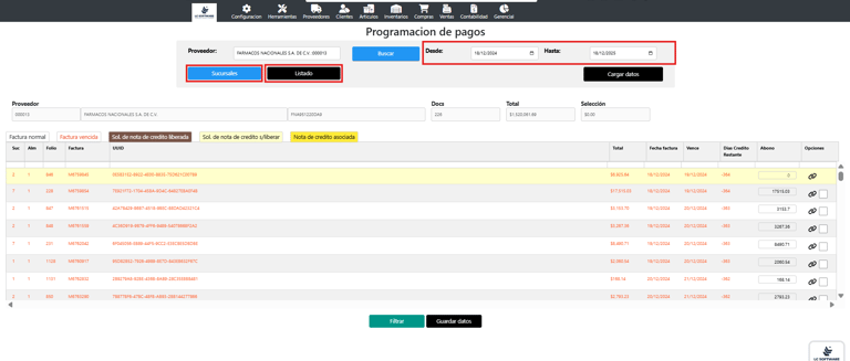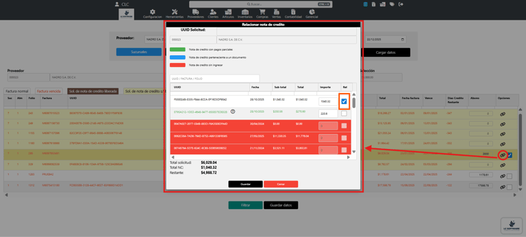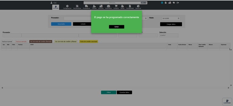 En caso de tener solicitud, esta factura se liberará.Al confirmar la acción, la nota de crédito queda correctamente relacionada y aplicada dentro de la programación de pagos.