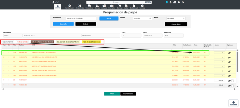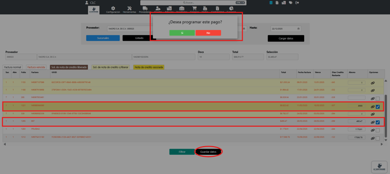 Posteriormente, se seleccionan las casillas de las facturas a aplicar y se da clic en Guardar datos.